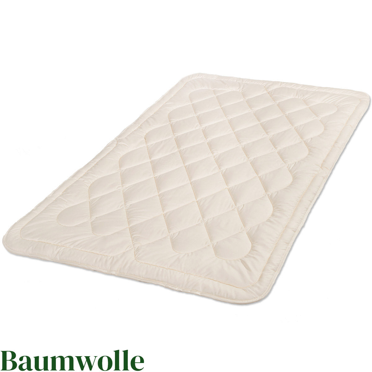 Baumwolle ist ein rein pflanzliches Naturprodukt und somit vegan. Seine Faserstruktur macht den Stoff hautfreundlich. Baumwolle wirkt angenehm kühl und weich und ist daher besonders angenehm für Menschen, denen schnell warm wird oder empfindliche Haut haben. Außerdem ist sie atmungsaktiv und kann fast ein Viertel ihres Eigengewichts an Feuchtigkeit aufnehmen, ohne sich klamm anzufühlen. Unsere Baumwollbettdecken sind bis 60°C waschbar und somit auch für Menschen mit Allergien gegen Tierhaare oder Hausstaubmilben geeignet.