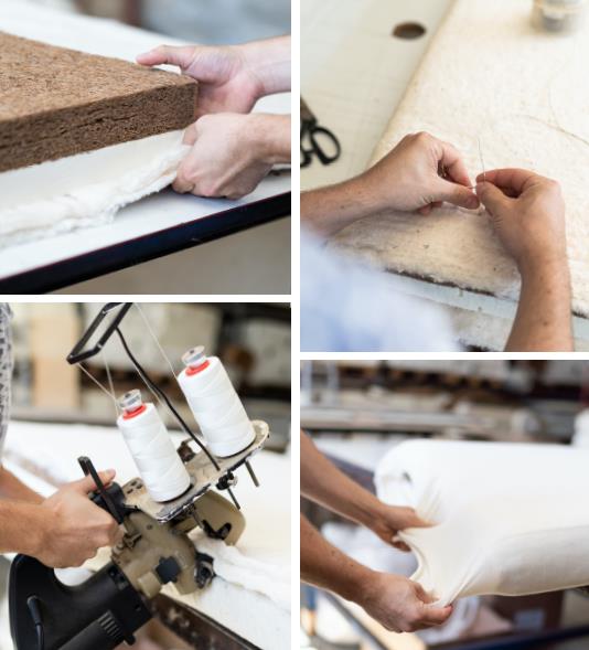 Die Matratzenfertigung, die dem Polsterhandwerk sehr ähnlich ist, ist echte Handarbeit. Die einzelnen Schichten aus Naturkautschuk und Kokoskautschuk werden übereinander gelegt und mit einem Vlies aus Baumwolle oder reiner Schurwolle abgedeckt. Dann nähen wir die Elemente locker per Hand zusammen. Ein Bezug aus waschbarem Drellstoff oder ein Steppbezug bringt die Matratze in Form.