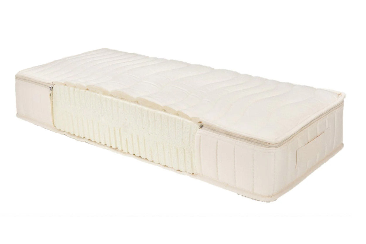 Unsere Wohlfühl-Matratze gibt es in vier Festigkeiten. Den 15 cm hohen Kern umschließt ein versteppter Bezug, dessen Oberseite abnehm- und austauschbar ist. Wählen Sie zwischen einer Oberseite mit Schafschurwolle oder Baumwolle (vegan).