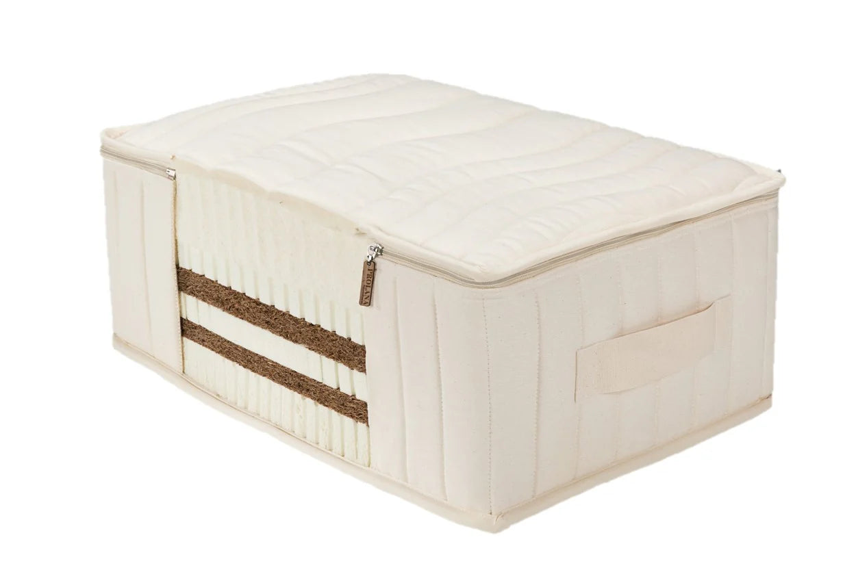 Premium-Bezug mit Hülle aus Drell-Stepp: Baumwolle kbA versteppt mit Vlies aus Schafschurwolle kbT (weich, anschmiegsam) oder Baumwolle kbA (vegan). Abnehmbare Oberseite Doppeljersey, gefüllt mit Vlies aus wahlweise Schafschurwolle kbT oder Baumwolle kbA.