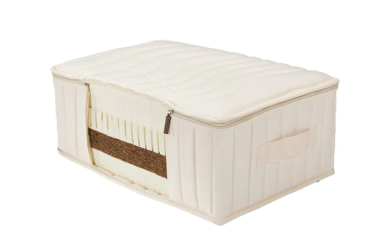 Premium-Bezug mit Hülle aus Drell-Stepp: Baumwolle kbA versteppt mit Vlies aus Schafschurwolle kbT (weich, anschmiegsam) oder Baumwolle kbA (vegan). Abnehmbare Oberseite Doppeljersey, gefüllt mit Vlies aus wahlweise Schafschurwolle kbT oder Baumwolle kbA.